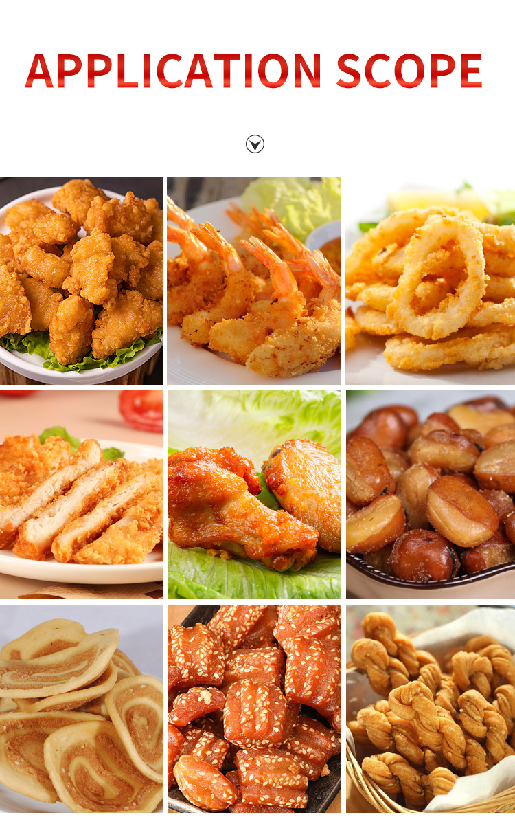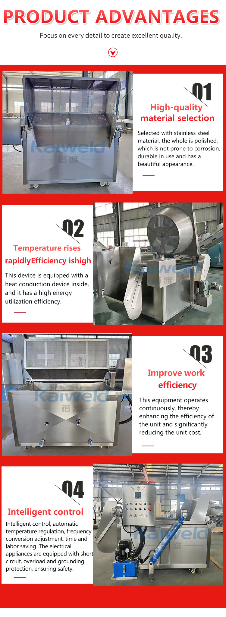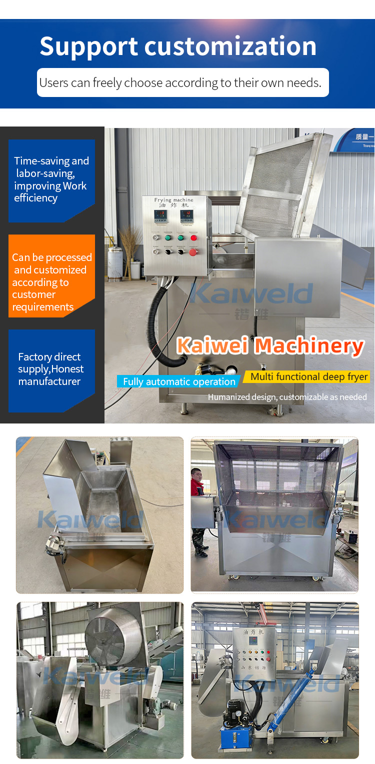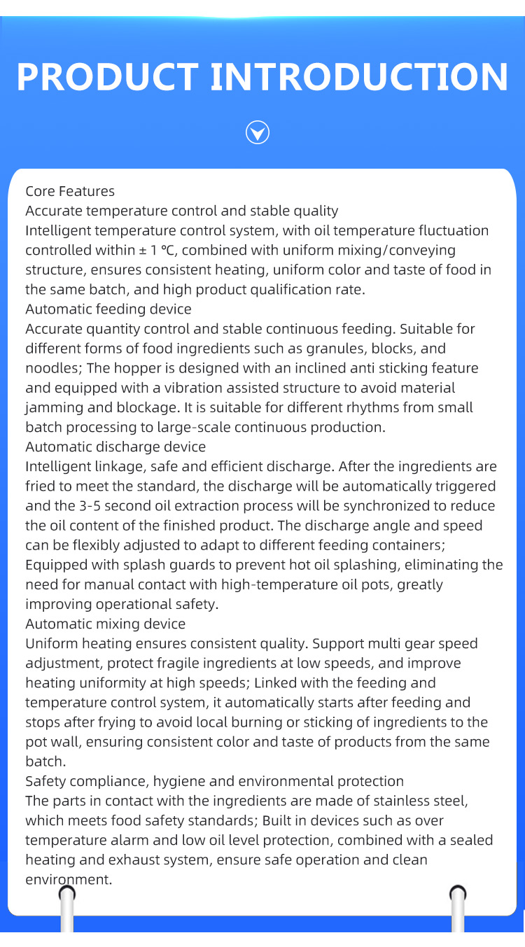 On the basis of traditional fixed frying machines, an automatic stirring mechanism has been added to evenly stir the material in the oil through mechanical stirring, avoiding adhesion and uneven local heating. It is particularly suitable for frying granular, loose, and easily clumped food and is widely used in small and medium-sized production scenarios such as nuts, beans, snacks, and soy products.