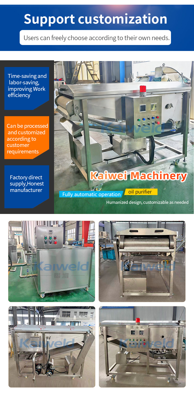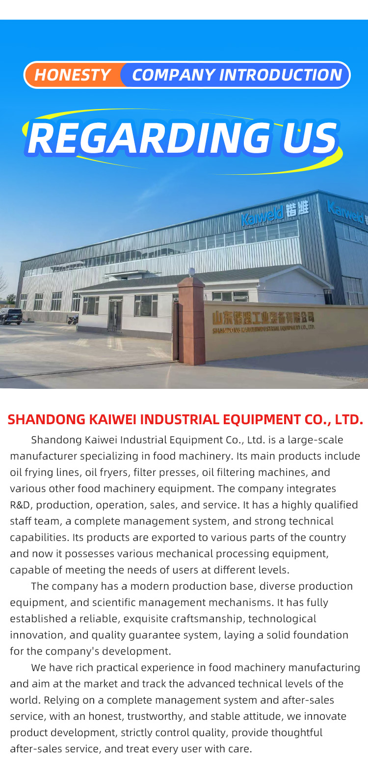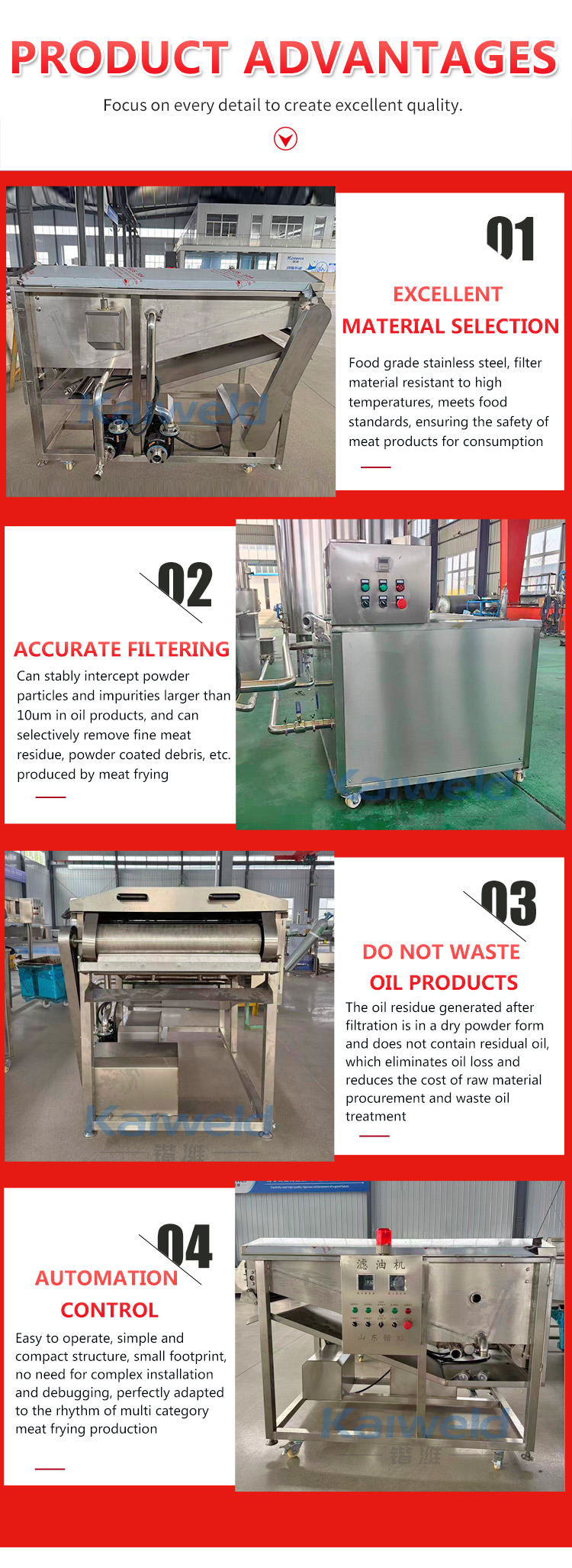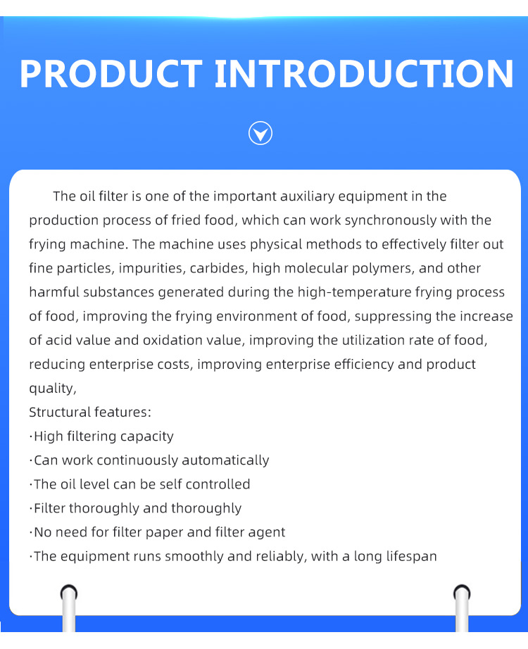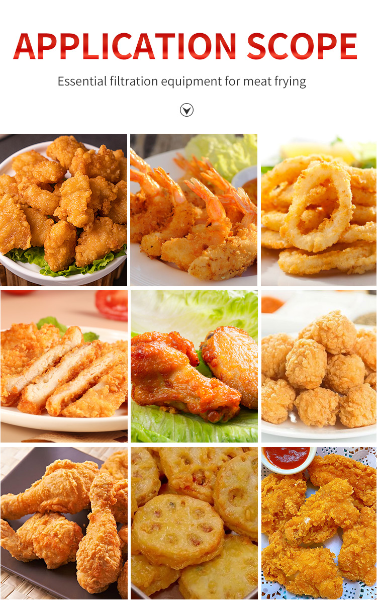 It is mainly used to remove food residues, carbides, colloids and other impurities in high-temperature frying oil, delay oil oxidation and rancidity, extend the service life of frying oil, stabilize the quality of fried products, reduce production energy consumption and waste oil treatment costs, and reduce the purchase of new oil and waste oil treatment costs. It is an indispensable key supporting equipment in modern food industrial frying production.