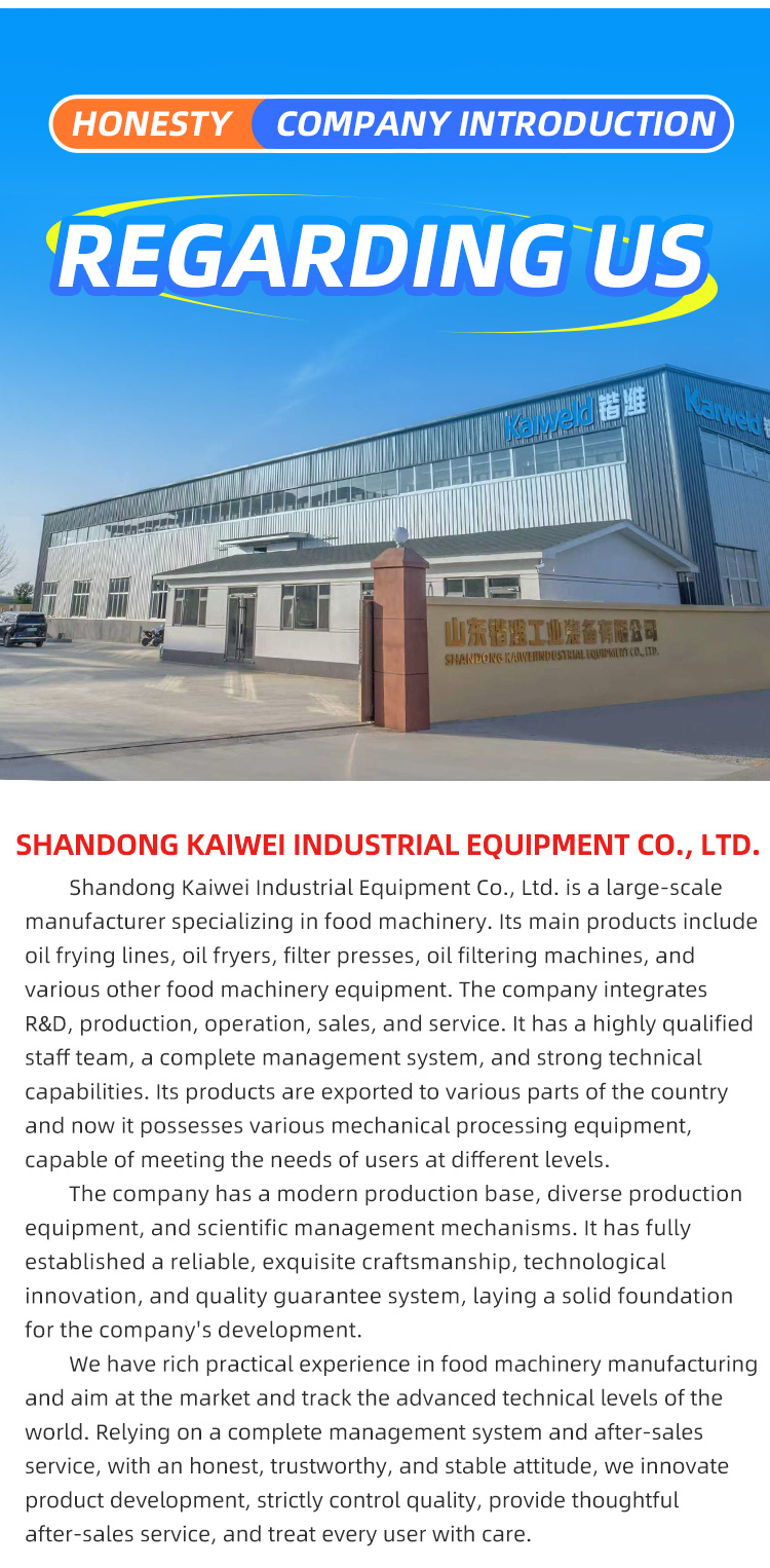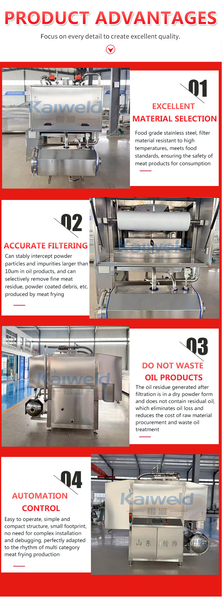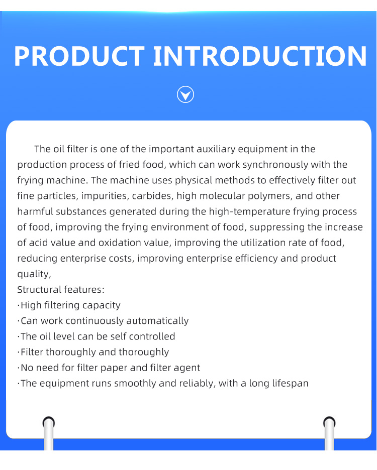 It can remove food residues, carbides, suspended fine particles and other impurities from oil, delay the deterioration of frying oil, extend the oil change cycle, and ensure uniform color and no impurity pollution of fried products. It is a cost-effective oil filtration equipment in small and medium-sized frying production, widely used in the frying process of food factories, central kitchens, and soy product processing plants.